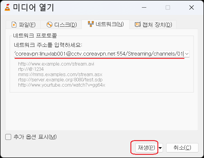 ¾Æ·¡ ÁÖ¼Ò(rtsp: ...)¸¦ ÀÔ·Â(º¹»çÇØ¼ ºÙ¿©³Ö±â) ÇϽʽÿÀ. --> "Àç»ý"